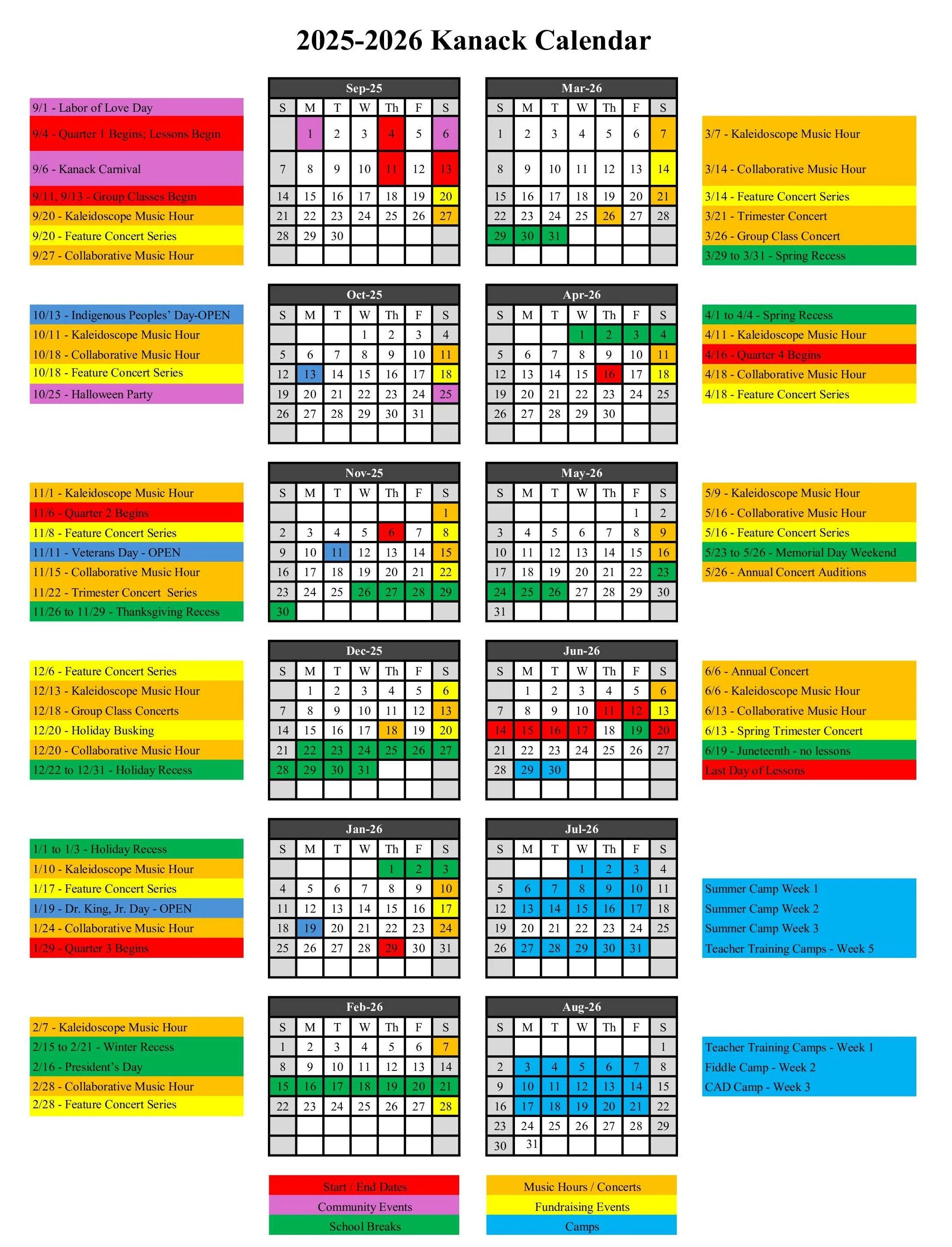 Closings: Please note that we do not close on some school holidays in order to allow all students to get a full 36-week year of private lessons.